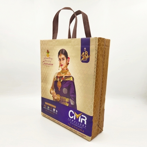 CMR Jewellers is a big brand in Andhra Pradesh and Telangana. The eye catchy design was provided by the client and Bags Guru gave it a Midas touch to bring the bag to life. This is a multi layer bag to bring out the gold shine effect that does justice to the quality for a brand like CMR JEWELLERS. The bag color can be customized & is manufactured using laminated non-woven fabric.